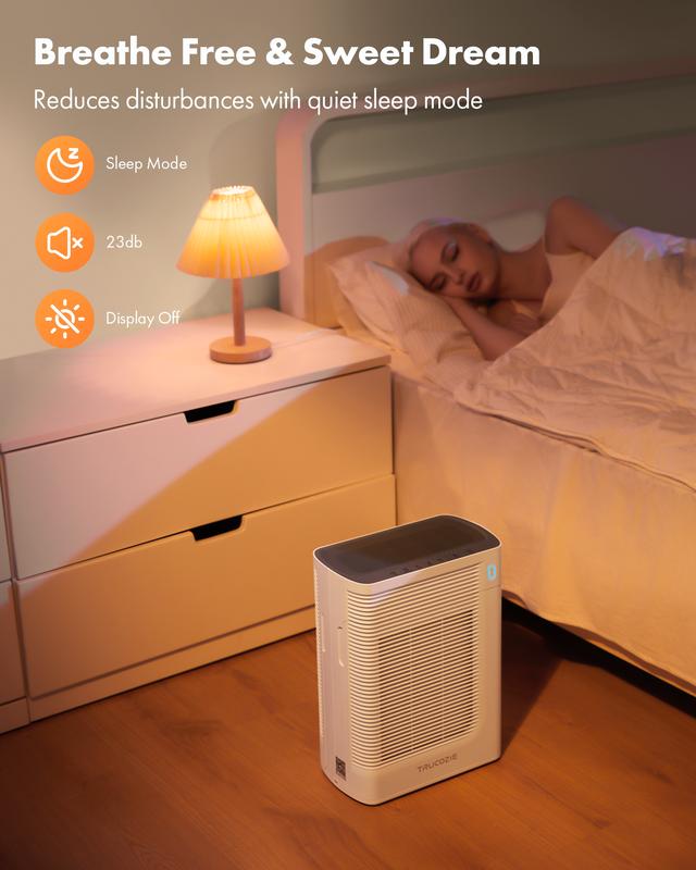 ·Large Coverage: Trucozie air purifier is perfect for large, indoor spaces, especially large bedrooms. It has a CADR of 176 CFM (300 m³/h) and can purify the air of 1937 ft² space once/hour.·Double Sided Air Inlet: Purify your air quickly. With a double-sided, super-large air inlet, it offers a stronger purification speed and better purification effect. Achieve super-strong air circulation on both sides.·High Performance Filtration: Our H13 True HEPA filter provides powerful filtration, with 99.97 percent efficiency in effectively filtering out particles such as smoke, pollen, pet dander and hair. ( Tested by an independent lab. )·PM 2.5 Air Quality Sensor: The air purifier is equipped with a PM2.5 dust sensor, which can monitor the air quality in the current environment in real time. When the air quality decreases, the indicator light will show purple or red, and the fan will speed up to clean the air faster. You can get the health of the air at real time.·Sleep Mode: When in sleep mode, the Trucozie T356 bedroom air purifier will automatically adjust the fan speed to run at the lowest speed with low noise (less than 24dB) to protect your air quality while you rest. ( Tested by an independent lab. )·Auto Mode: When you don't know which fan speed to choose , auto mode can help you automatically adjust the appropriate fan speed for you, which is energy-saving and environmentally friendly, and can always ensure that the indoor air is in the best condition, creating a comfortable environment for you.·After Sales Service: Each Trucozie air purifier comes with 12-month warranty, 7*24hrs customer service and life-time technical support. If you encounter any problems, please feel free to contact us.